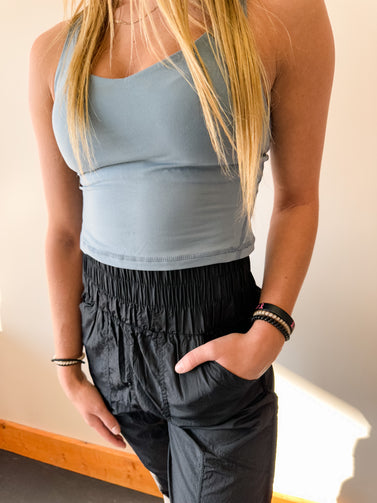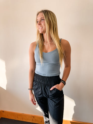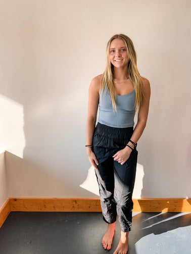 These pull-on joggers are the best twist on athleisure. Perfect for daily wear they pair perfectly with your workout tops or your favorite tee! We are obsessed with the high waistband and windbreaker material. Of course she has pockets!