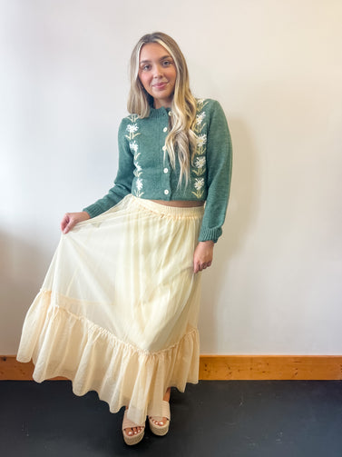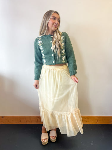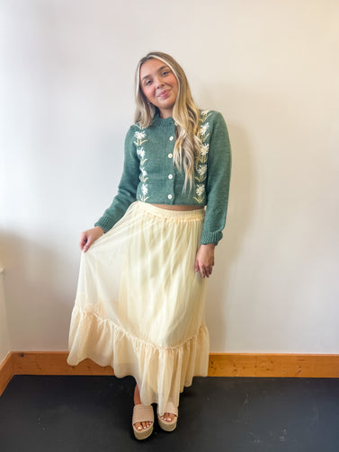 Elevate your sweater game with this ultra-chic cropped cardigan featuring delicate floral accents. Pair it with your favorite high-waisted jeans for a stylish daytime look!
