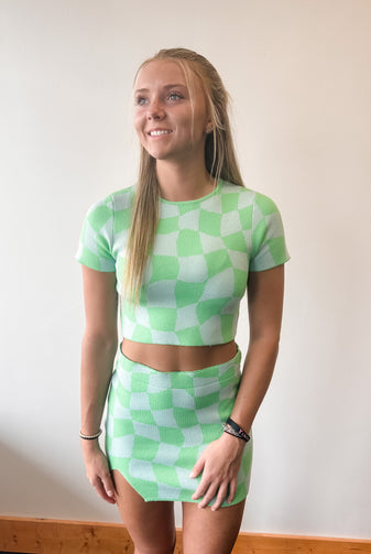 Enjoy a walk in the spring air in this short sleeve sweater and skirt set! Stretchy knit with checkered design shapes a slightly cropped sweater with a round neckline. The matching skirt has a high banded waist, a figure-skimming silhouette that ends above the knee.