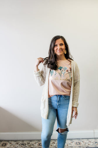 Mary is also wearing the Like Me for Me Cardigan in Oatmeal.