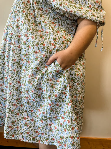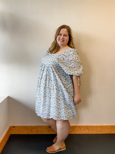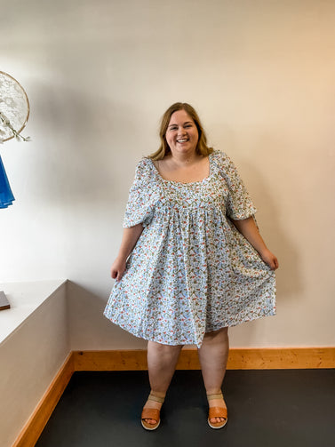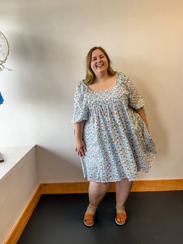 This beautiful baby doll dress is covered in blue and orange florals. Perfect for a date night or night out with the girls.