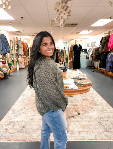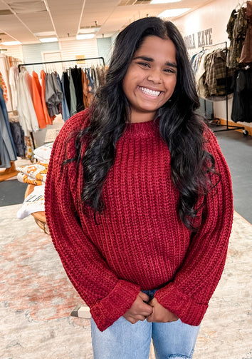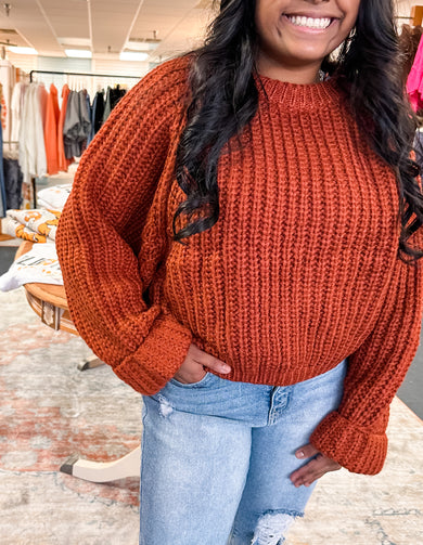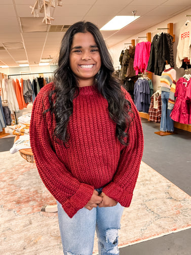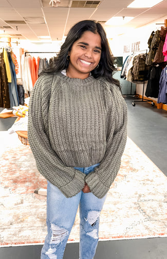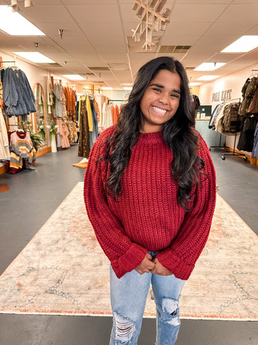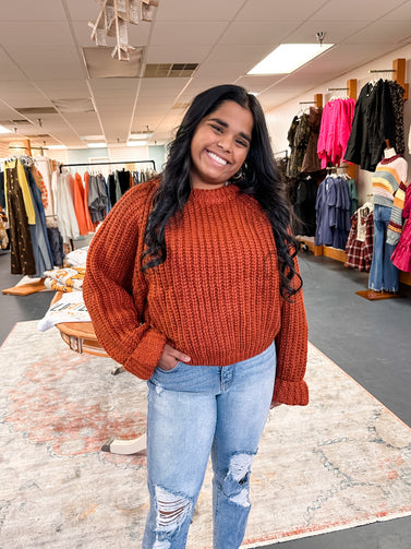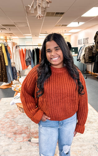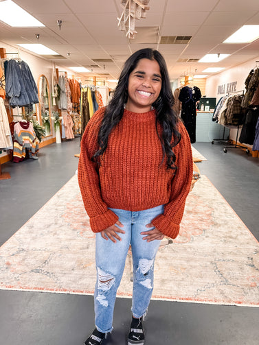 Transitioning through the seasons is a breeze in this cropped knit sweater! Ribbed crew neckline and relaxed drop shoulder long sleeves. The boxy bodice ends at a cropped banded hem that pairs perfectly with high-waisted jeans!