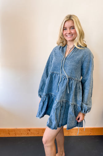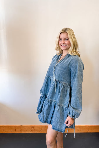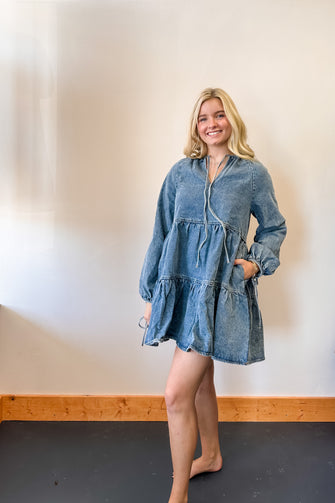 t’s easy to see why everyone is in love with this v-necked tiered mini dress! Made of a true denim this dress with balloon sleeves and a babydoll bodice falls into tiered seams and ends at a mini hem.
