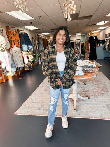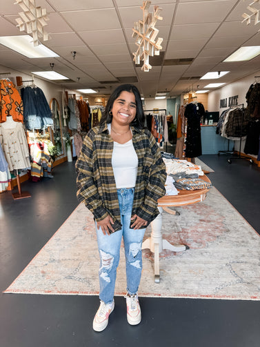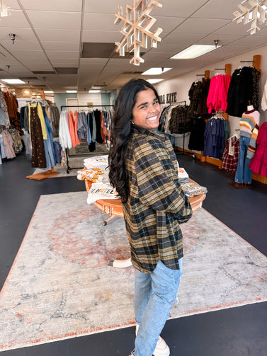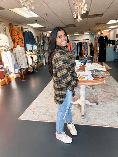 Functional yet fashionable is what this plaid button up shacket is all about! Thick woven plaid fabric shapes this versatile jacket with a collared neck and long sleeves with button cuffs. The boxy bodice features two patch pockets and a full button placket.