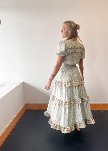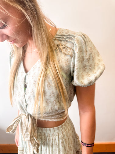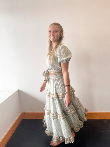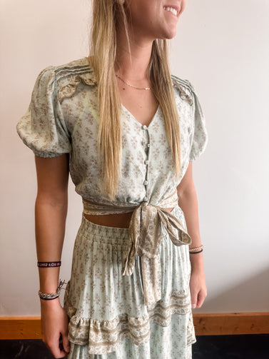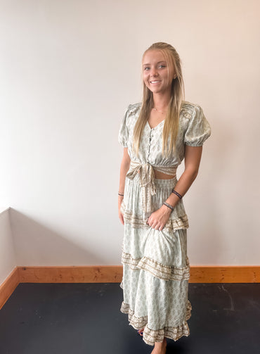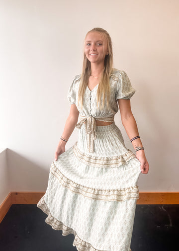 Get dressed for a magical time dancing the night away in this tiered midi skirt and blouse set! An alluring bandana print adorns lightweight organza that shapes a banded self tying waist that tops a romantic skirt that falls in tiers to a midi hem. Elastic at back for fit.