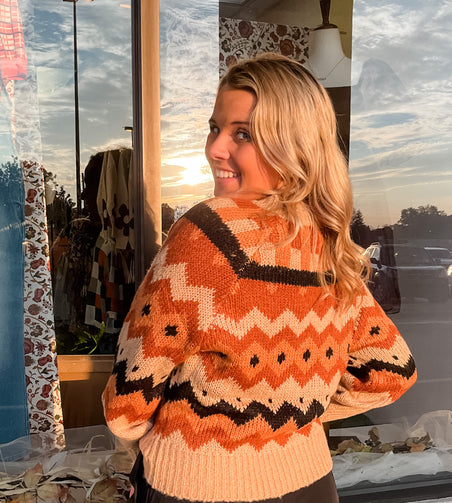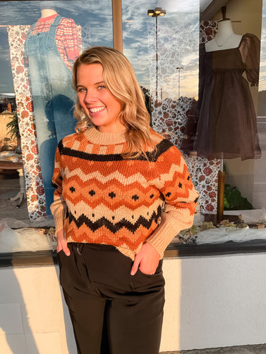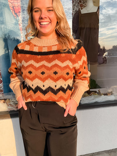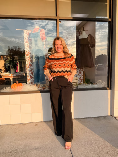 Rock this knitted geometric sweater all season long to stay cute and trendy! This knit sweater, featuring playful geometric stripes, shapes this sweater that has a rounded neckline, long sleeves, and a slightly cropped bodice. Pair with jeans and boots for a cute & trendy fall look or with a pair of our slacks for a professional look in the office!