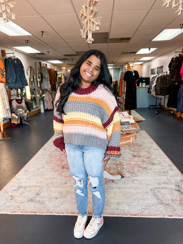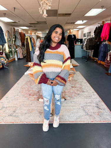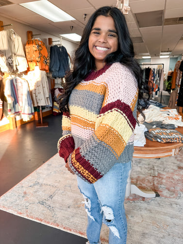 You'll be hearing compliments all day long in this multi-color mock-neck knit sweater! Colorful chunky knit shapes this sweater vest has a round mocked neckline and a relaxed cropped bodice. Ribbed knit at the neck, sleeves, and hem.