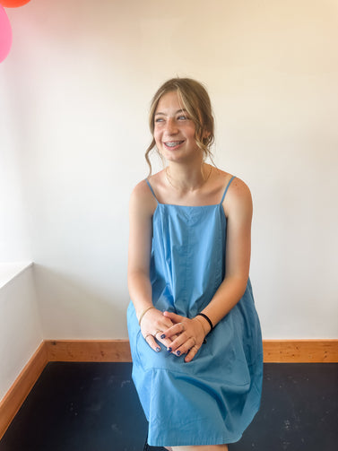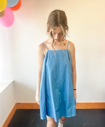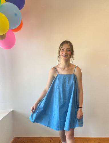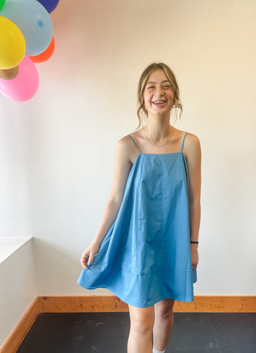 The back of the dress is adorned with a row of charming buttons, adding a classic touch and making the dress easy to slip on and off. Whether you're heading to a casual brunch, a garden party, or a day out in the sun, this Blue Swing Dress with pockets, tie shoulders, and back buttons is your go-to choice for effortless style and comfort.