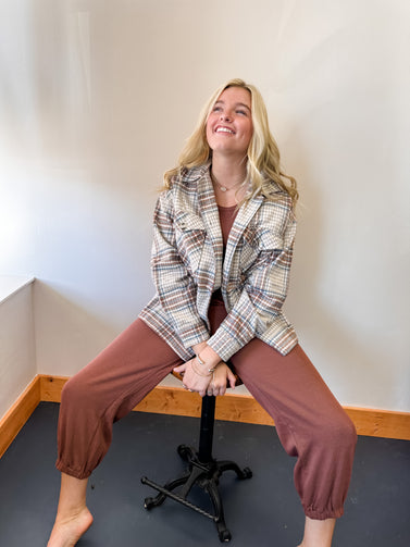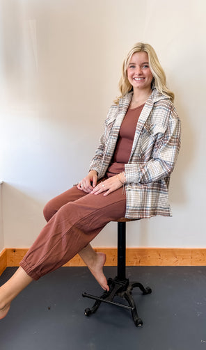 This lightweight joggers and tank set are perfect for any kind of workout! The material is breathable but not constricting, and the high waist adjustable waist is so flattering. Pair with sneakers for a cool morning run, or one of our shackets for a fall hike!