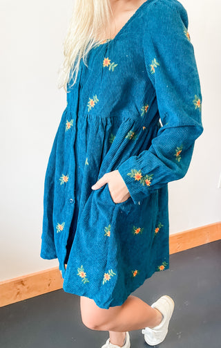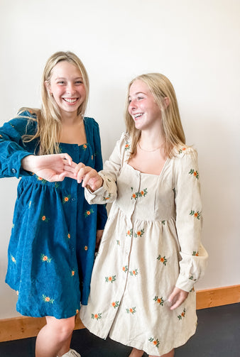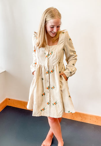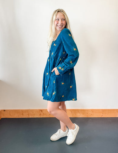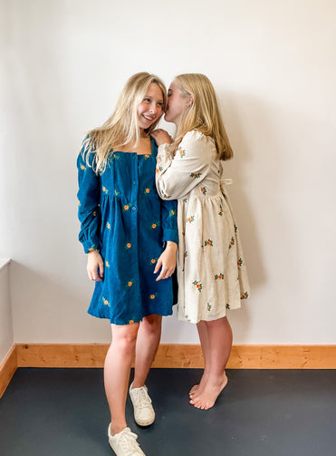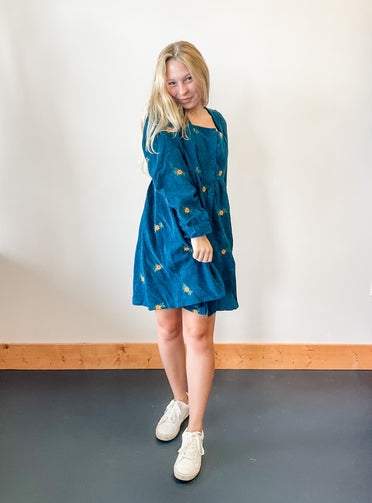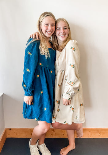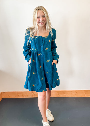 Corduroy is our favorite for this fall. With a square neck, buttons, and pockets we couldn't resist getting her in two different colors.